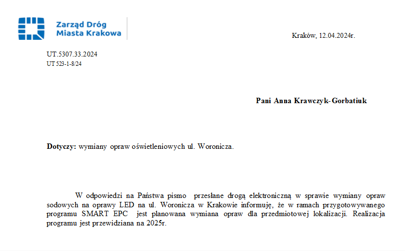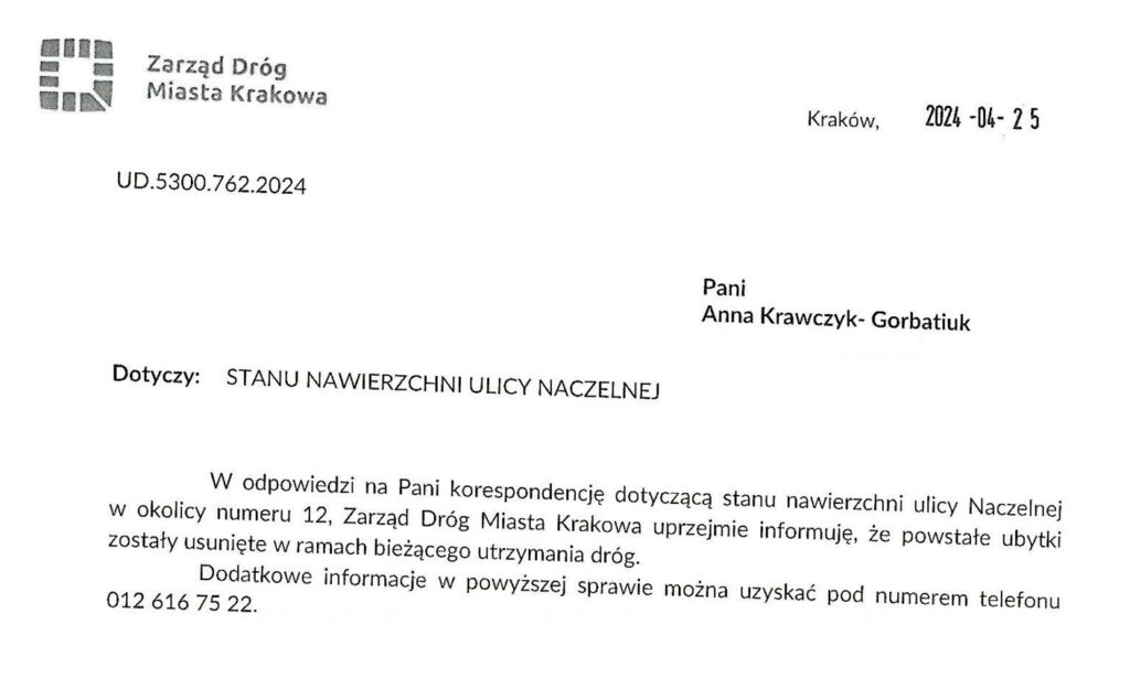 Dzięki zgłoszeniu otrzymanemu od mieszkańca i mojej interwencji wykonano naprawę zapadniętego chodnika przy ul. Combrowej. Co prawda ekipa zostawiła po sobie trochę bałaganu ale pracę wykonała. Wszelkie sprawy wymagające pilnej interwencji Zarządu Dróg Miasta Krakowa można zgłaszać pod nr telefonu 126167555 (całodobowo, 7 dni w tygodniu) lub na adres: zgloszenia@zdmk.krakow.pl Pod powyższym numerem telefonu można również zgłaszać problemy z oświetleniem ulicznym, które co jakiś czas zdarzają się w naszym okręgu.