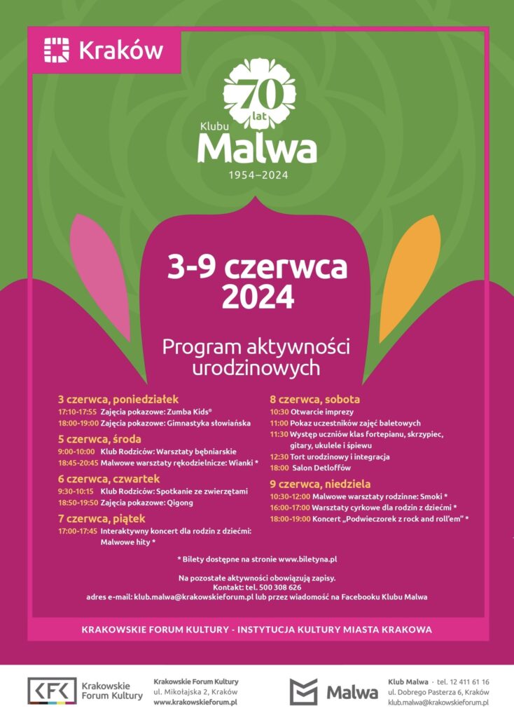 8 czerwca, sobota, godz. 10:00-13:00 – Urodziny Malwy W tym roku Klub Malwa obchodzi swoje 70. urodziny! Z tej okazji przygotowaliśmy dla Was wyjątkowe wydarzenia, w tym pokaz uczestników zajęć baletowych oraz występ uczniów klas fortepianu, skrzypiec, gitary, ukulele i śpiewu, a także na integrację i tort urodzinowy. Zapraszamy do wspólnego świętowania! Wstęp wolny! Zapisy nie obowiązują!