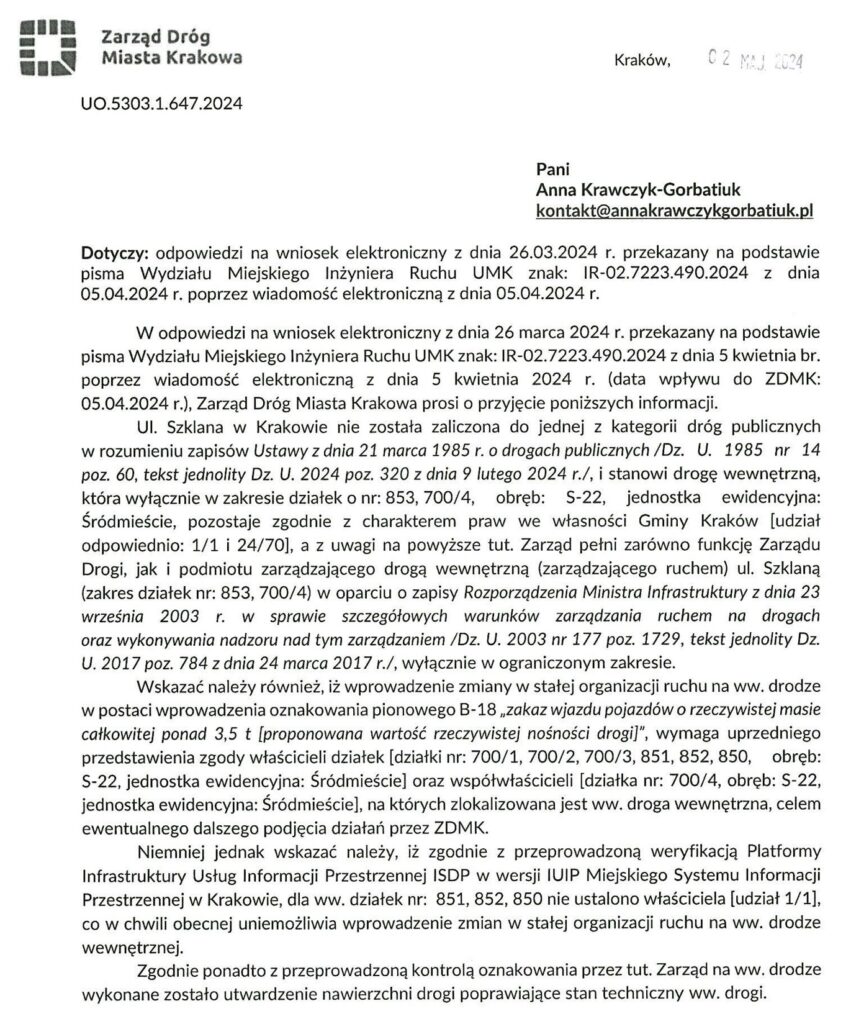 Odpowiedź Zarządu Dróg Miasta Krakowa na pytanie o możliwość zamontowania znaku ograniczenia tonażu na wjeździe w ulicę Szklaną aby cięższe pojazdy nie pogarszały stanu nawierzchni. Ulica ta nie posiada nawierzchni asfaltowej.