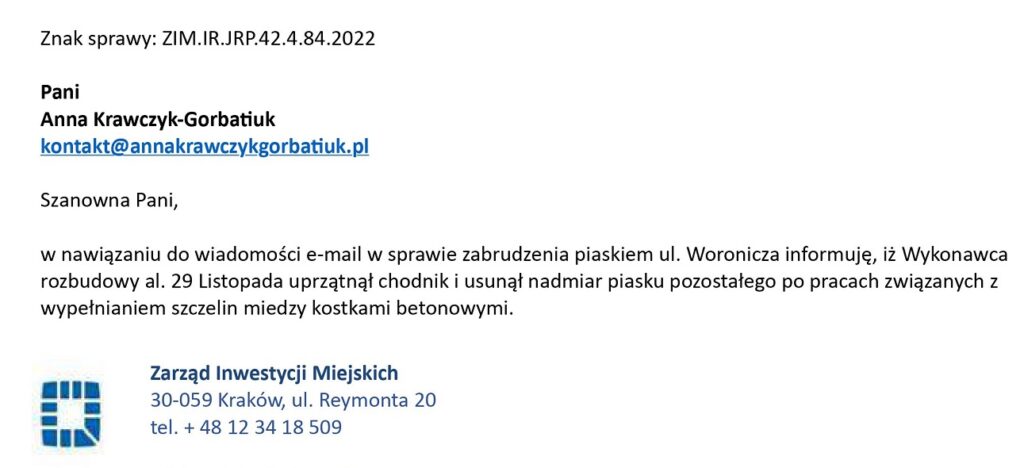 12 kwietnia wysłana prośba do Zarządu Inwestycji Miejskich o usunięcie piasku, zalegającego na chodniku po wykonanej przebudowie al.29 Listopada. Poniżej odpowiedź jednostki.