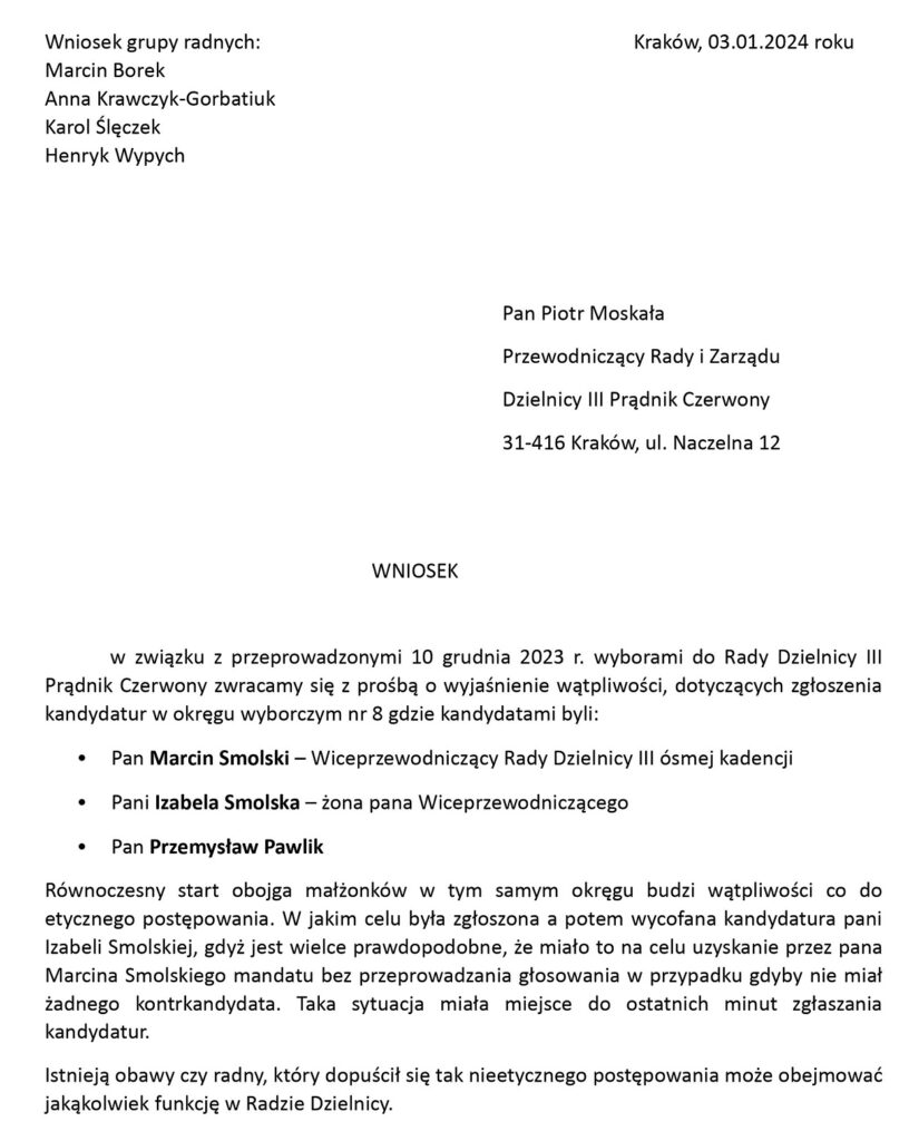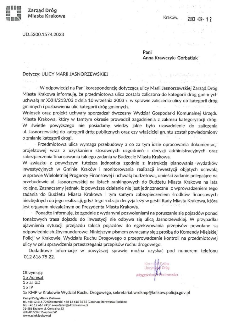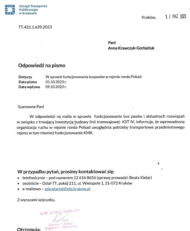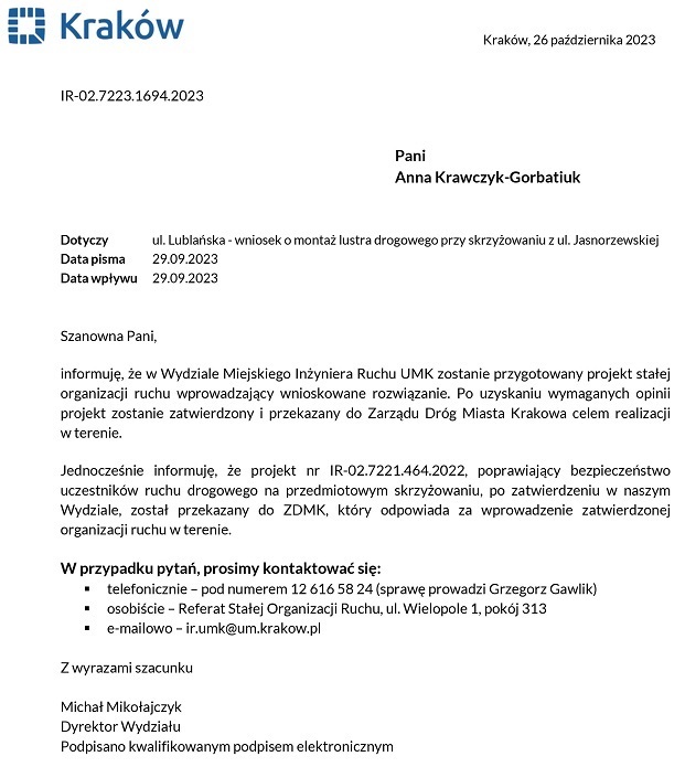 – Rada Dzielnicy III Prądnik Czerwony nie ma też pewności, że pas do zawracania w kierunku wschodnim powstanie na podstawie umowy nr 621/U/ZDMK/2023, zawartej z inwestorem prywatnym w 2023 roku. Dotychczas inwestor nie wystąpił z wnioskiem o przekazanie terenu pod realizację przedmiotowej inwestycji drogowej. Ponadto zawarcie umowy nie przesądza o realizacji inwestycji drogowej, ponieważ jej realizacja jest uwarunkowana procesem inwestycyjnym zależnym od inwestora.