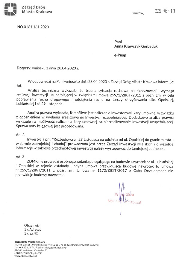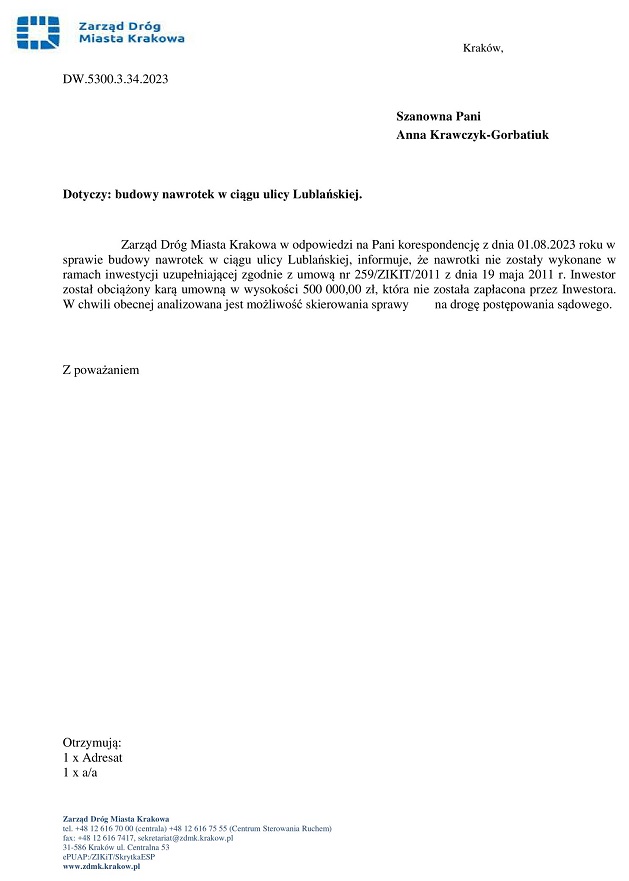Niestety, w aktualnym stanie rzeczy, jako mieszkańcy nie możemy wpłynąć na wykonanie zawrotek przez gminę. Zawrotki powinien wykonać inwestor, który tego nie zrobił (a był zobligowany umową z 2011 roku) lub zapłacić karę umowną w wysokości 500 tys. zł. Sprawa miała zostać skierowana na drogę postępowania sądowego i dopiero po wyroku sądowym będzie możliwość starania się o wykonanie tej inwestycji przez gminę. Same obietnice kandydata nie wystarczą. Aktualnie czekam na odpowiedź z Zarządu Dróg Miasta Krakowa czy sprawa została skierowana na drogę sądową.