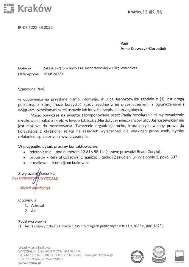 W sprawie objęcia ulic: Woronicza, Rezedowej, Dominikanów, Nabielaka, Ciołkowskiego, Rokitniańskiej, Ostroroga, Combrowej, Białych Brzóz i Jasnorzewskiej strefą ograniczonego transportu w celu wyeliminowania tranzytu przez bardzo wąskie uliczki „naszego” (jak nazwał kandydat mieszkający na ul. Ułanów…) osiedla wielokrotnie pisałam do Zarządu Dróg Miasta Krakowa i Wydziału Miejskiego Inżyniera Ruchu.